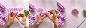 – Các bạn hãy lặp lại quy trình như đã hướng dẫn đối với 14 cánh hoa còn lại. Mỗi cánh hoa sẽ được làm từ một đoạn kẽm tím nhạt đã cắt và gấp. Hãy đảm bảo rằng tất cả các cánh hoa đều được gấp đôi, gấp thêm một lần nữa và xoắn chặt phần đuôi lại một cách cẩn thận để tạo nên sự đồng nhất và đẹp mắt cho toàn bộ bông hoa.