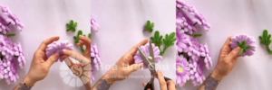 – Tiếp theo dùng keo nến gắn đài tròn vào nhụy hoa, dùng kéo cắt bỏ phần thừa của nhụy hoa và gắn lá đai vào.